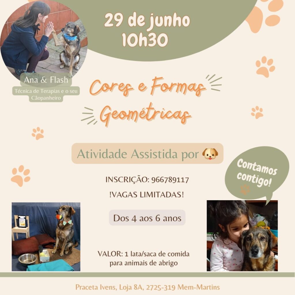 A dupla, Ana Paula Passos & o seu cão, “Flash – o rafeiro”, promovem no próximo sábado, dia 29 de junho, a atividade “Cores e Formas Geométricas” para crianças dos 4 aos 6 anos, de “estímulo cognitivo que para além de educativa, vai ser também muito divertida”, refere ao Correio de Sintra, Ana Paula Passos, Técnica de Terapias Assistidas Por Animais que conta com o apoio incondicional do seu `fiel cãopanheiro´.