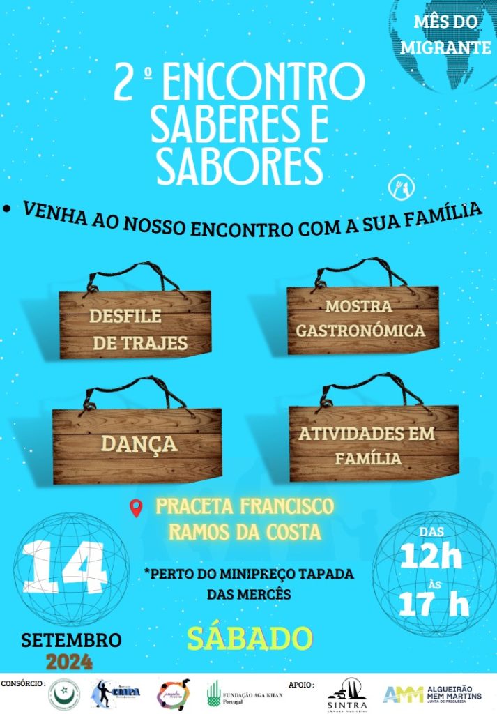 Realiza-se este sábado, dia 14 de setembro, o 2.º Encontro Intercultural Saberes e Sabores, que terá lugar, na Praceta Francisco Ramos da Costa, na Tapada das Mercês, entre as 12h00 e as 17h00.