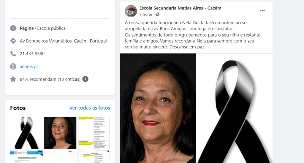 Nela Guida, funcionária na Escola Matias Aires, em Agualva, faleceu esta terça-feira, vítima de atropelamento, na Avenida dos Bons Amigos, em Agualva. Aconteceu pelas 21h00. O condutor não prestou assistência à vitima e fugiu do local.